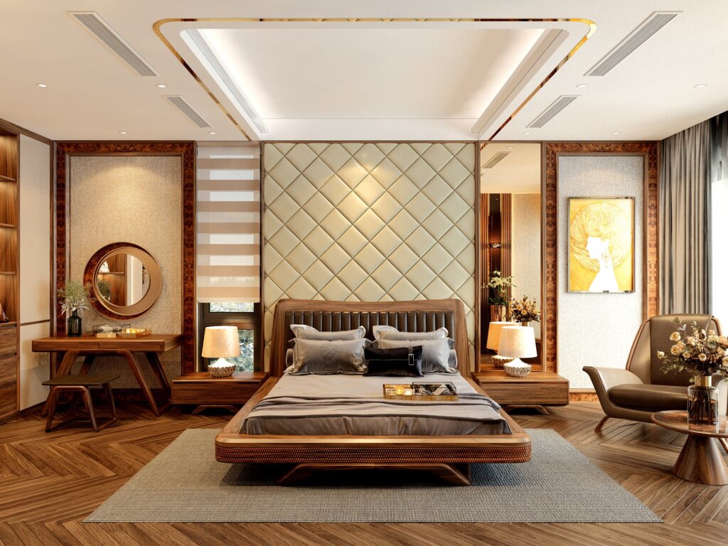 Trang trí: Nội thất gỗ với các chi tiết chạm trổ, đồng và đồ vật trang trí cổ điển giúp tạo không gian hoài niệm. Bạn cũng có thể thêm các yếu tố như tranh vẽ cổ điển, gương trang trí, và những đồ vật lưu niệm để làm cho không gian phòng ngủ thêm phần quyến rũ và ấm áp.