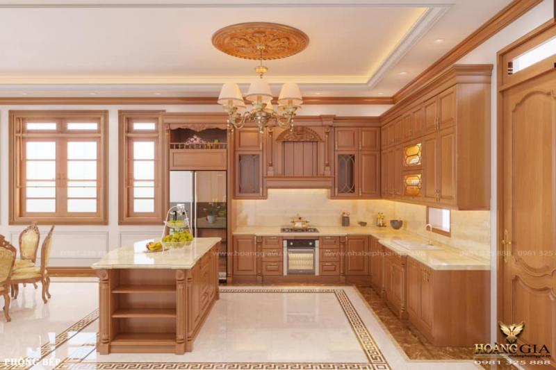 Nội thất gỗ tự nhiên với các đường nét chạm khắc tinh xảo là yếu tố không thể thiếu, hòa quyện cùng màu sơn để tạo sự sang trọng. Tay nắm tủ hoặc viền nội thất bằng kim loại ánh vàng hoặc bạc góp phần tăng vẻ quý phái, đồng thời tạo chiều sâu cho không gian.
